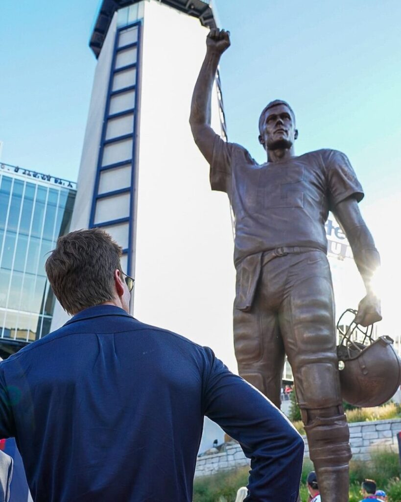 Durante una ceremonia de exaltación al Salón de la Fama de los Patriots llena de estrellas el pasado junio, en la que también se retiró el número 12 de Brady por el equipo, el propietario de los Patriots, Robert Kraft, anunció que había encargado una escultura de bronce de 12 pies de altura del quarterback un escultor local “para perpetuar el legendario legado del gran Tom Brady”.